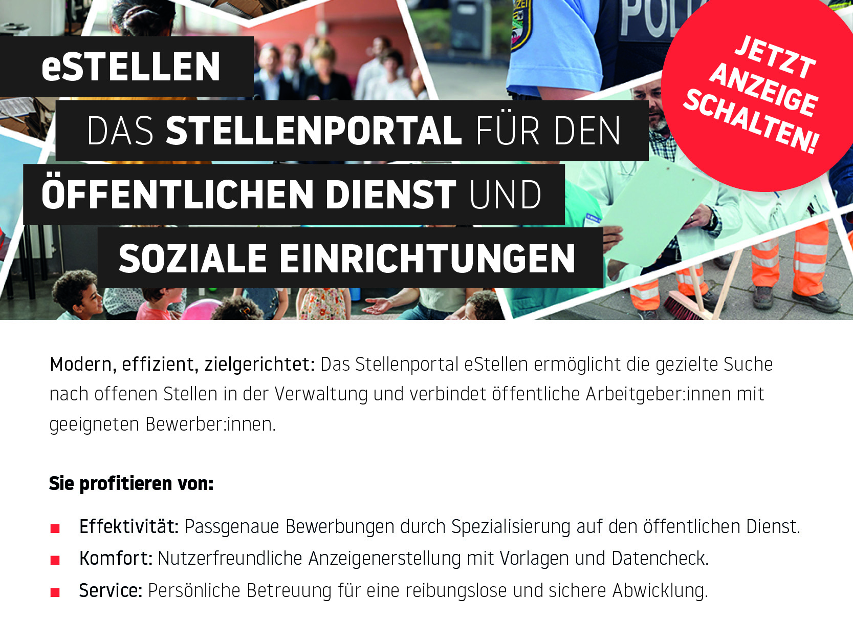 • Collage aus verschiedenen Berufsbildern: Polizei, Medizin, Büro, Pflege, Feuerwehr. Staatsanzeiger
