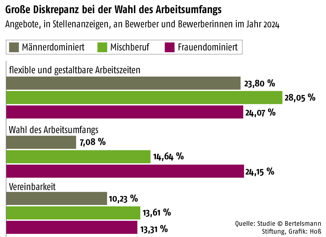 Dies senke, so Bertelsmann, die Wahrscheinlichkeit, dass Frauen sich auf männerdominierte Berufe ohne Vereinbarkeitsangebote bewerben und hindert auch Männer daran, in Phasen mit mehr Sorgearbeit zum Beispiel in Teilzeit zu arbeiten.