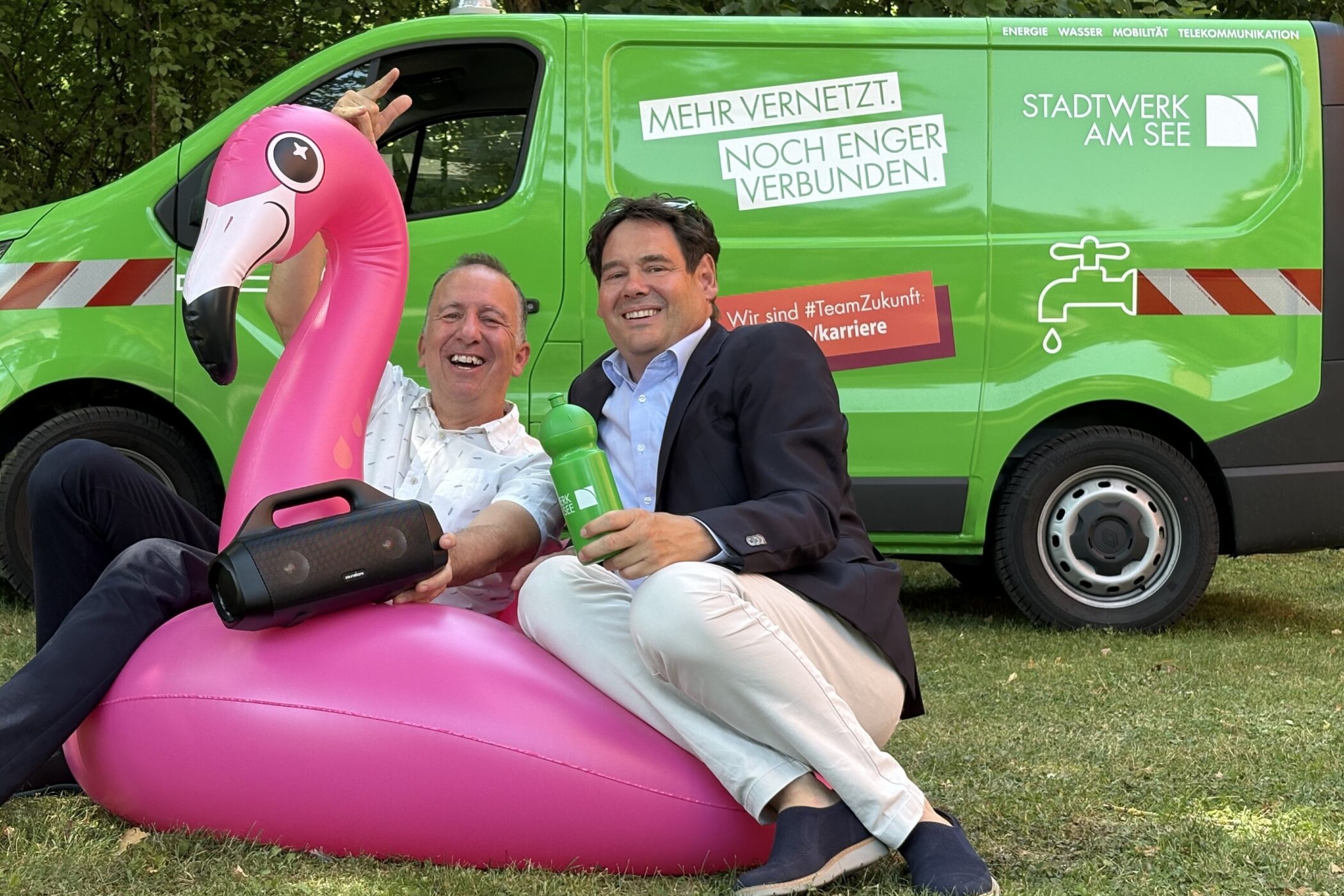 Stadtwerk am See-Geschäftsführer Alexander-Florian Bürkle (rechts) und Kommunikationschef Sebastian Dix präsentieren den Geschäftsbericht in Form von Hits.