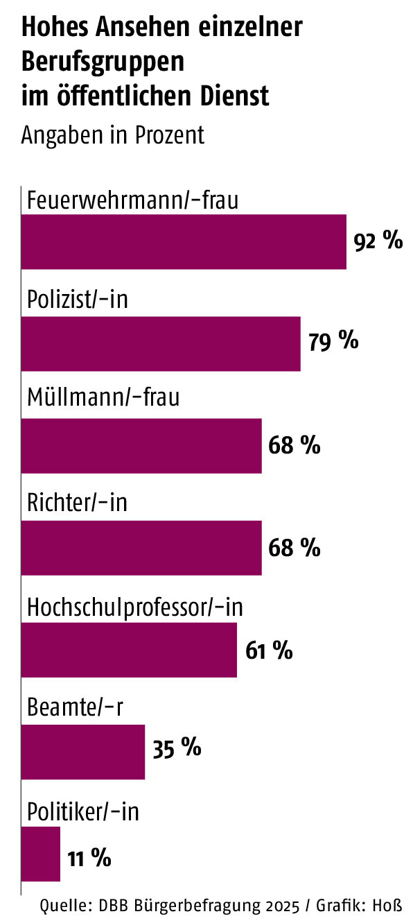 Und: Das Ansehen von Professorinnen und Professoren in der Öffentlichkeit ist im vergangenen Jahr gesunken: Nur noch 61 Prozent der Teilnehmerinnen und Teilnehmer der Bürgerbefragung Öffentlicher Dienst 2025 haben angegeben, dass diese Berufsgruppe ein hohes oder sehr hohes Ansehen habe, im Jahr zuvor waren es noch 70 Prozent.