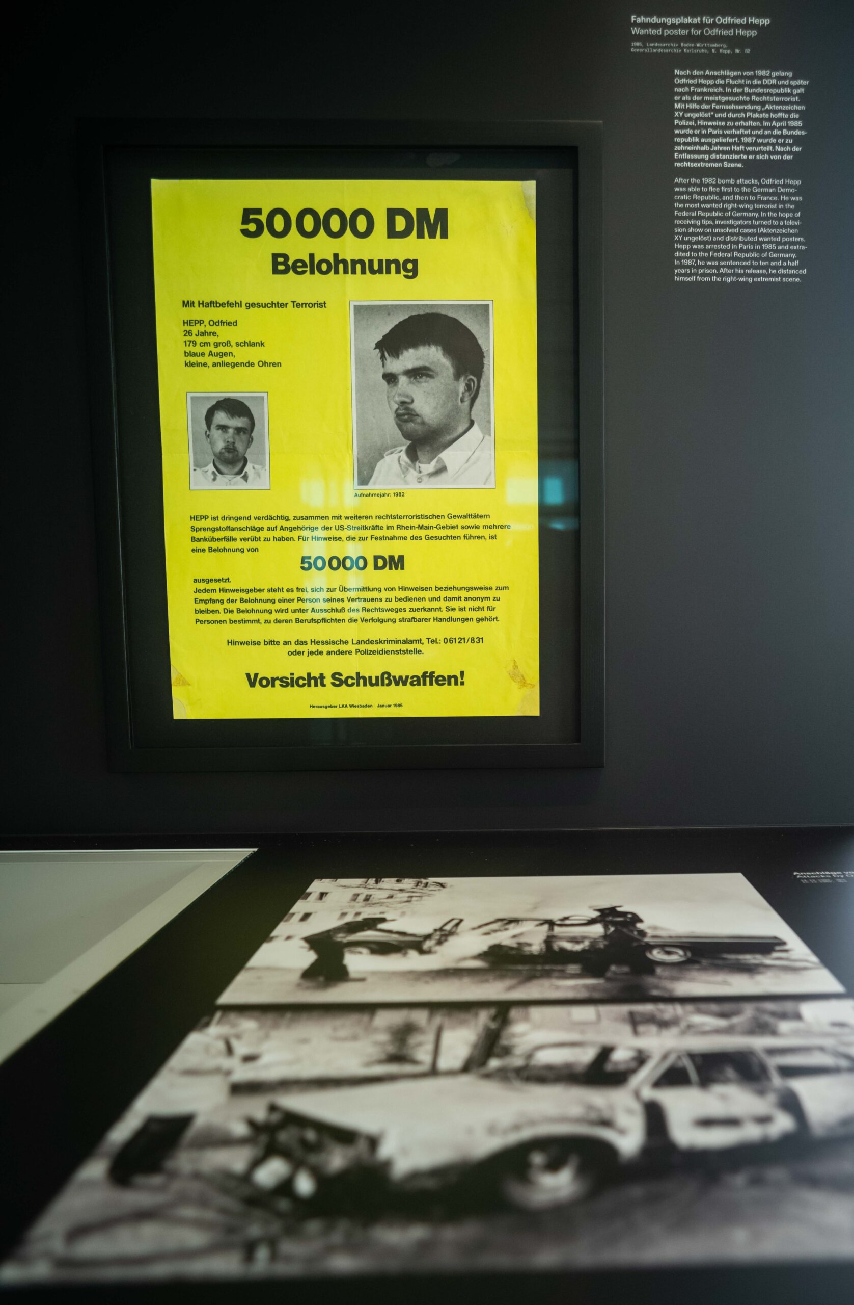 Auch ein Fahndungsplakat über den in Achern geborenen ehemaligen Neonazi Odfried Hepp ist zu sehen. Der hatte unter anderem 1982 mehrere Anschläge auf Einrichtungen und Angehörige der US-amerikanischen Streitkräfte und Banküberfälle in Deutschland verübt.