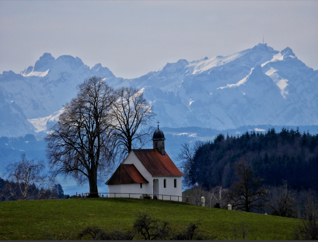 Die Kalvarienkapelle in Niederwangen im Allgäu steht auf einem Hügel und gilt als Wahrzeichen des Ortes.
