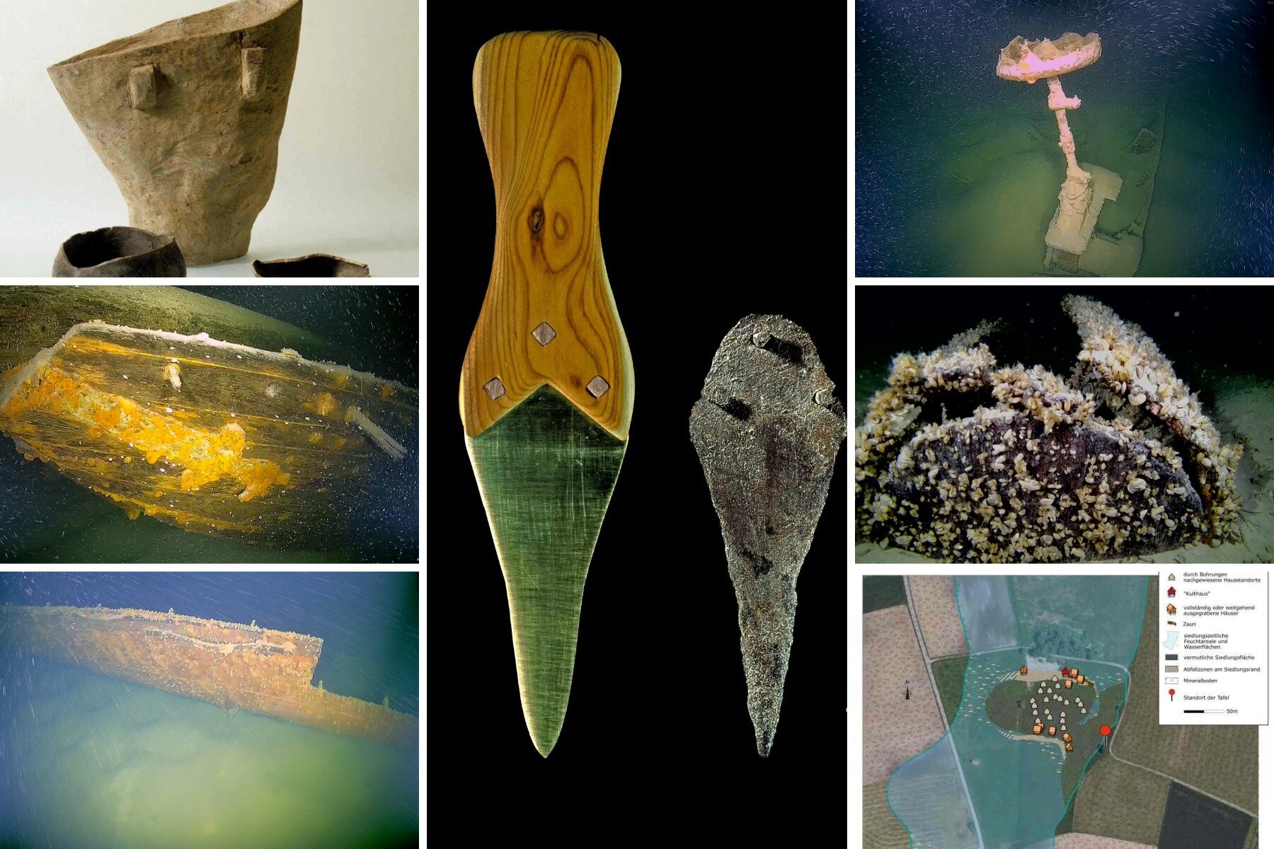 Im Bodensee wurden Reste eines Lastsegelschiffs entdeckt im Feuchtgebiet Reute-Schorrenried ein Kupferdolch und Holzgefäße. Fotos: Landesamt für Denkmalpflege/Collage: ant