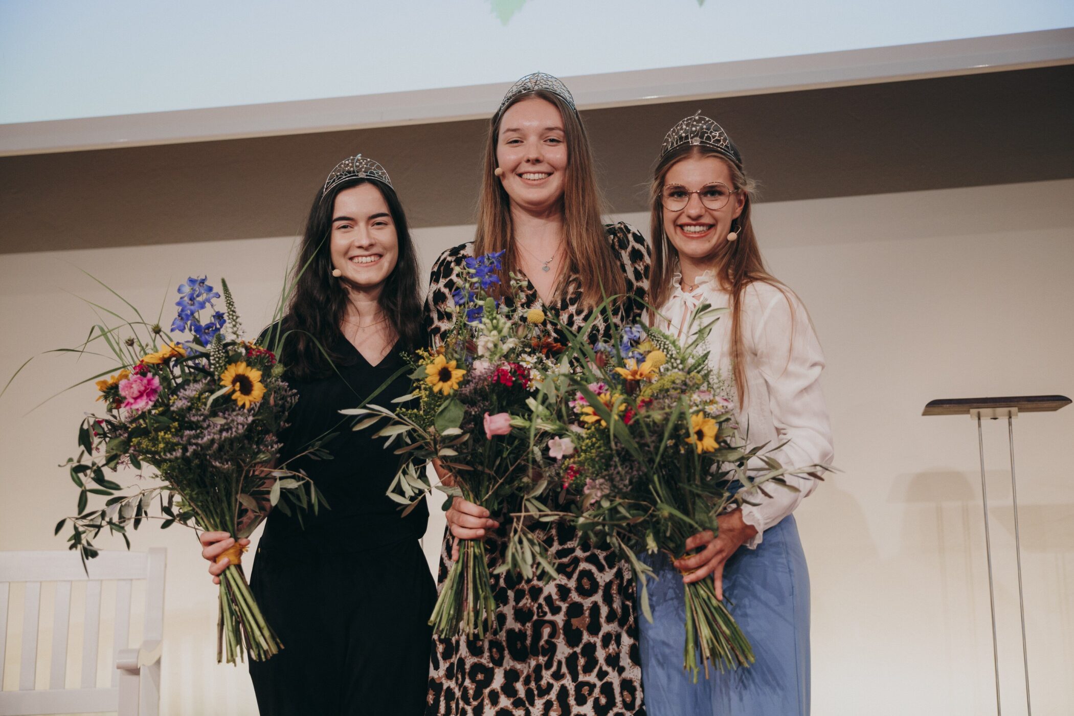 Weinkönigin Tina Glur (m.), mit den Prinzessinnen Hannah Spraul (l.) und Laura Münscher.