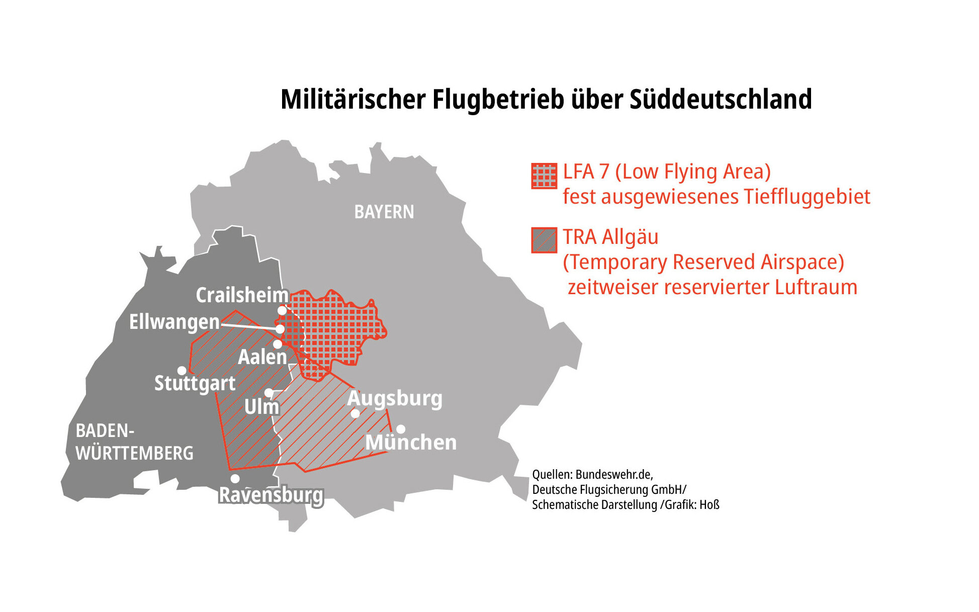 Für Baden-Württemberg ist vor allem die LFA 7 relevant. Sie liegt überwiegend in Bayern, reicht aber bis in den Ostalbkreis hinein. In den östlichen Randregionen des Landes, etwa im Raum Crailsheim und Ellwangen, können Tiefflugmanöver daher akustisch wahrgenommen werden.