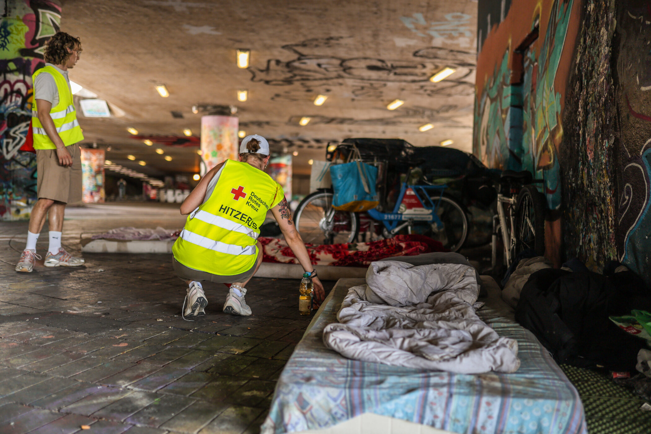 Willi Glück und Janine Funk verteilen Wasser, Apfelschorle und Kekse und haben in ihren roten Beuteln auch Sonnencreme dabei. Der 25 Jahre alte Student und die 34 Jahre alte Projektmanagerin sind an diesem heißen Tag in Stuttgart mit dem Hitzebus des Deutschen Roten Kreuzes (DRK) im Einsatz. Steigt das Thermometer in der Landeshauptstadt über 30 Grad, ist das orange beklebte Fahrzeug in der größten Mittagshitze unterwegs und bringt Getränke, Mützen und auch Snacks zu Obdachlosen und anderen Bedürftigen.