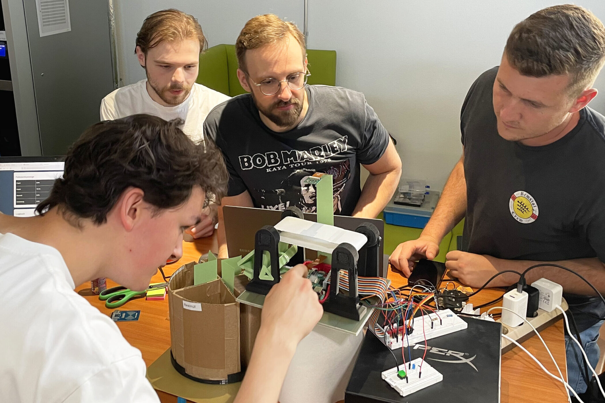 Künstliche Intelligenz darf nicht fehlen, so hat eine Gruppe eine Sortiermaschine konstruiert, die Müllsorten via Kamera erkennt und über ein Laufband in eine Tonne verfrachtet. Diese dreht ihre vier Müllfächer je nach Abfallart unter das Band. Die Unterscheidung trifft eine KI. Ist diese sich nicht wenigstens zu 65 Prozent sicher, unter welche Kategorie der Müll fällt, landet der Abfall im Fach für uneindeutige Fälle. Die Anwendung könne helfen, den Bahnhofsmüll zu sortieren, aber auch andere Sortiervorgänge, etwa in Bibliotheken, seien Anwendungsgebiete.