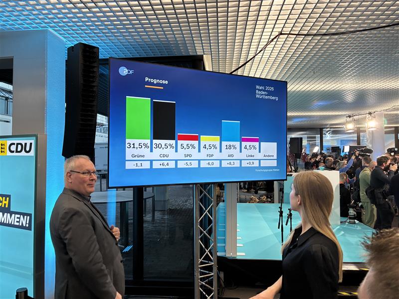 17.35 Uhr: Gespannte Erwartung bei der CDU, die im Geno-Haus in Stuttgart feiert. Alle warten auf die ersten Prognosen. Der Spitzenkandidat Manuel Hagel wird schon kurz nach 18 Uhr erwartet. Die Vize-Regierungssprecherin Nadja El-Almi sagt: „Wir sind gespannt optimistisch.“