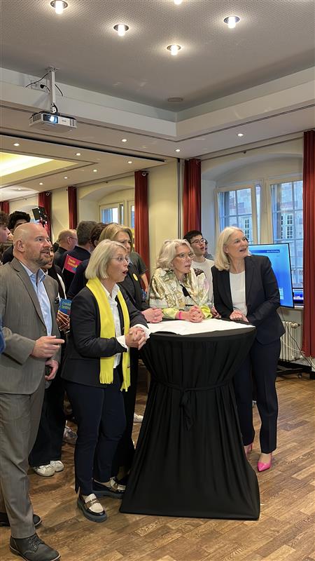 Schwelling hat viel Erfahrung, auch in solchen Situationen. Sie ist seit 2007 Parteimitglied, und vor allem hat sie als Sprecherin der Grünen Jugend 2016 schon einen grün-schwarzen Koalitionsvertag mit ausverhandelt. Am Wahlergebnis begeistert sie, „wie aufgegangen ist, was wir uns vor Monaten vorgenommen haben“. Damals sei nicht sicher gewesen, dass die Kampagne „wirklich so zieht“. Jetzt herrsche „übergroße Freude“. Und morgen beginne die Arbeit mit Gremiensitzungen, mit dem Dank an alle Mitarbeitenden und mit den ersten internen Gesprächen in der Sondierungsgruppe ihrer Partei, die sich bereits auf die Beratungen mit der CDU vorbereite. (bjhw)