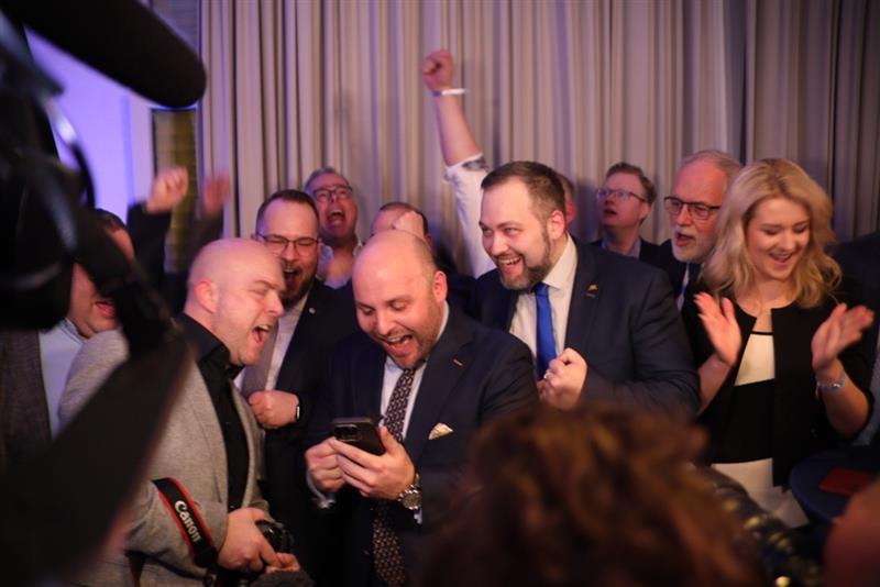18.25 Uhr: 18 Prozent – und die FDP und die Linke sind raus! Markus Frohnmaier (Mitte mit Handy) und seine Parteifreunde von der AfD freuen sich über das Wahlergebnis. (smic)