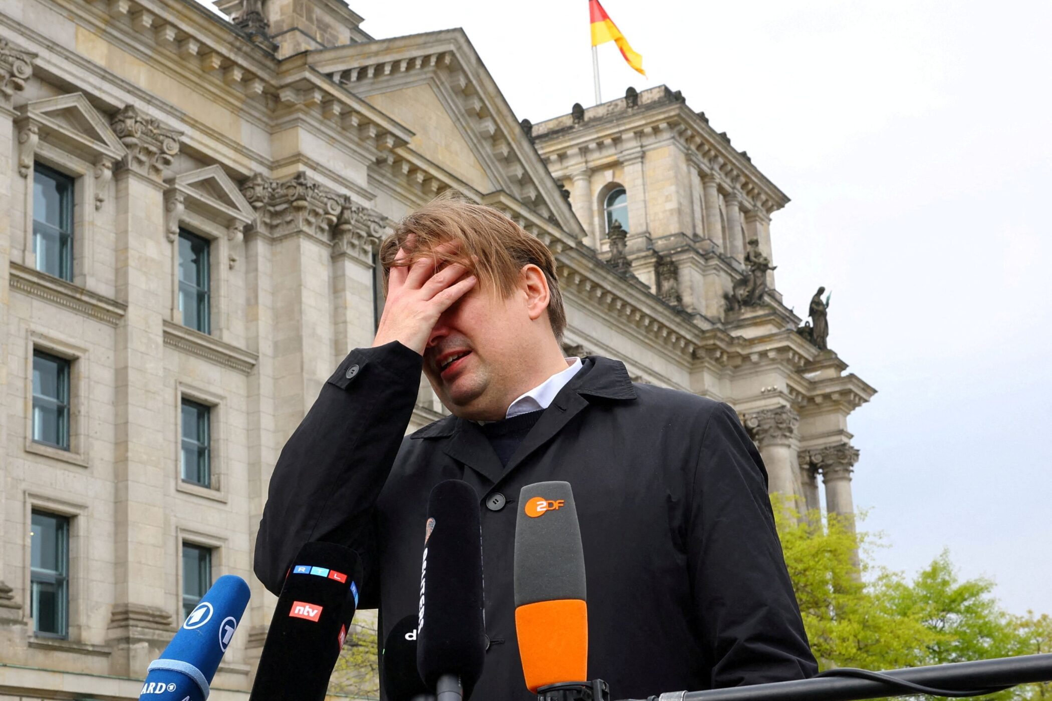 Maximilian Krah, Mitglied des Europäischen Parlaments für die rechtsextreme Alternative für Deutschland und Spitzenkandidat der AfD bei der Wahl zum EU-Parlament im Juni, gibt eine Erklärung ab, nachdem ein Mitarbeiter in Deutschland unter dem Verdacht der "besonders schweren" Spionage für China festgenommen wurde.