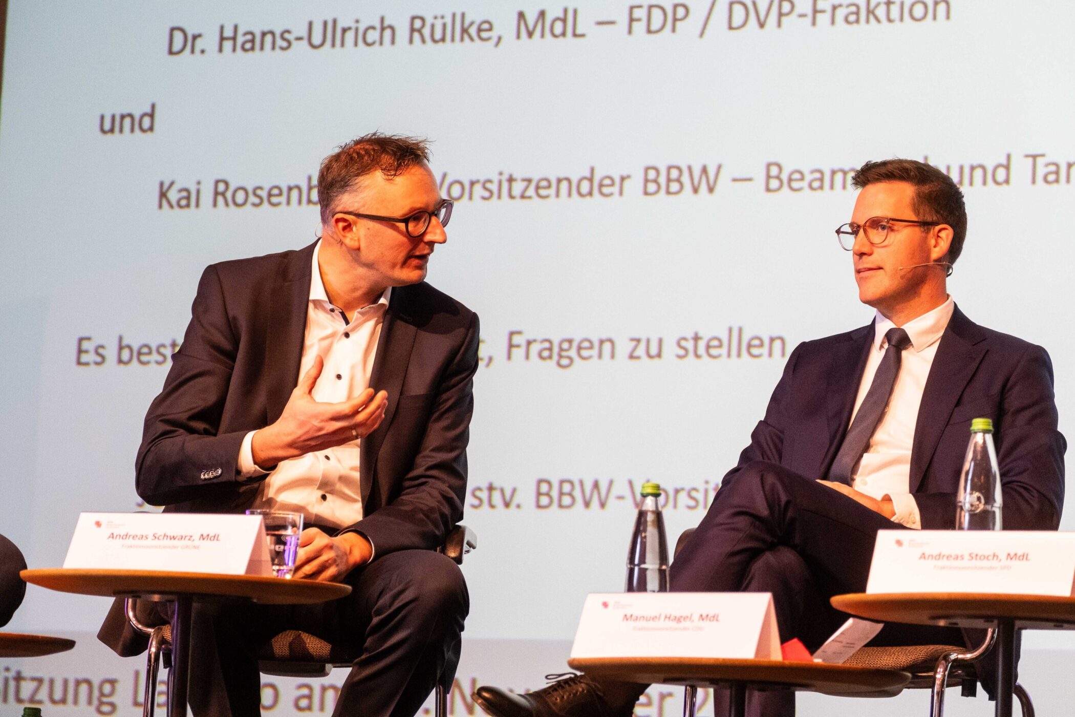 Grünen-Fraktionschef Andreas Schwarz (links) bremst sein CDU-Kollegen Manuel Hagel, der den Beamten gerne beim Thema Wochenarbeitszeit entgegenkommen würde.