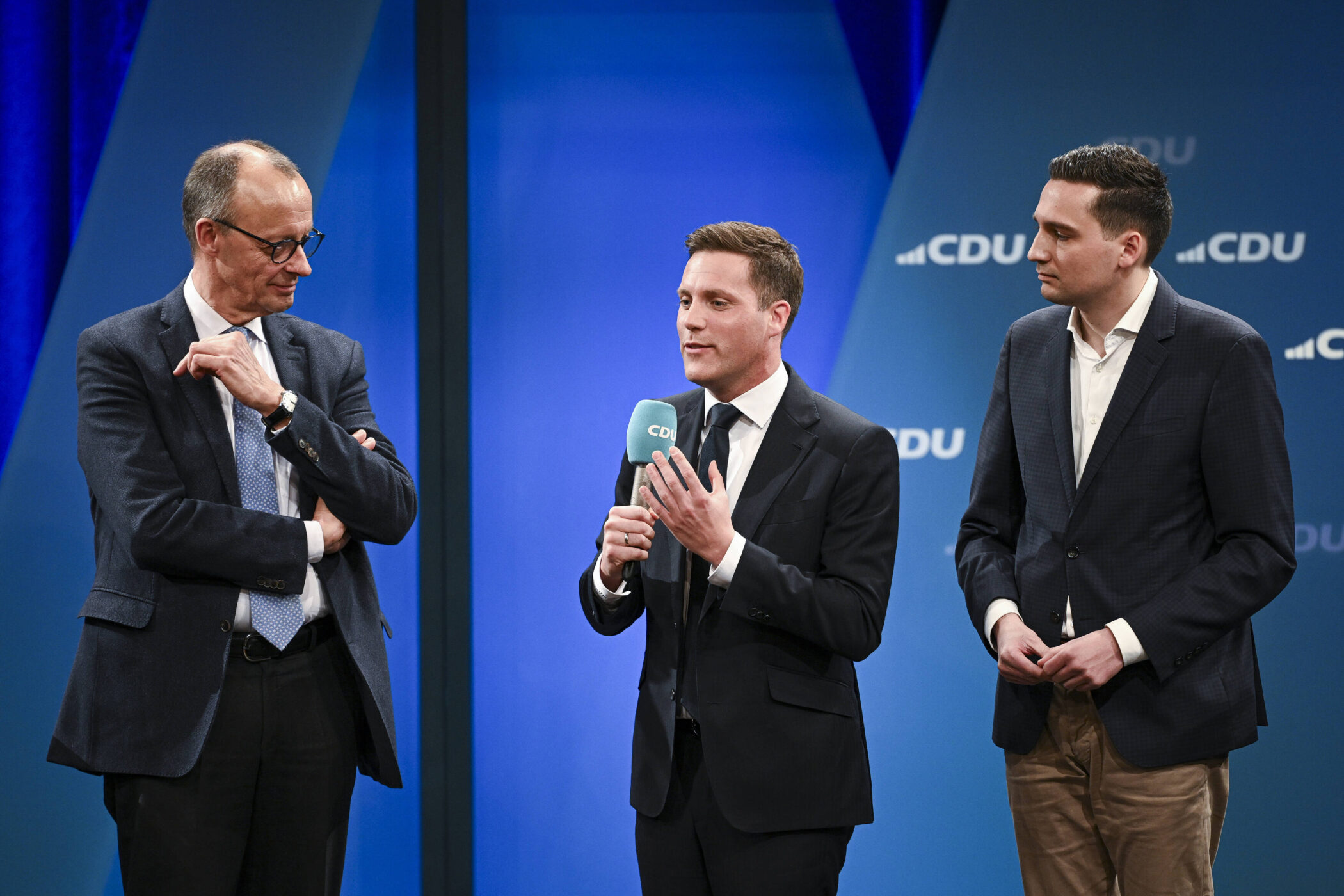 Friedrich Merz, Manuel Hagel und Levin Eisenmann (von links) diskutieren am 5. Februar in der Stadthalle Singen.