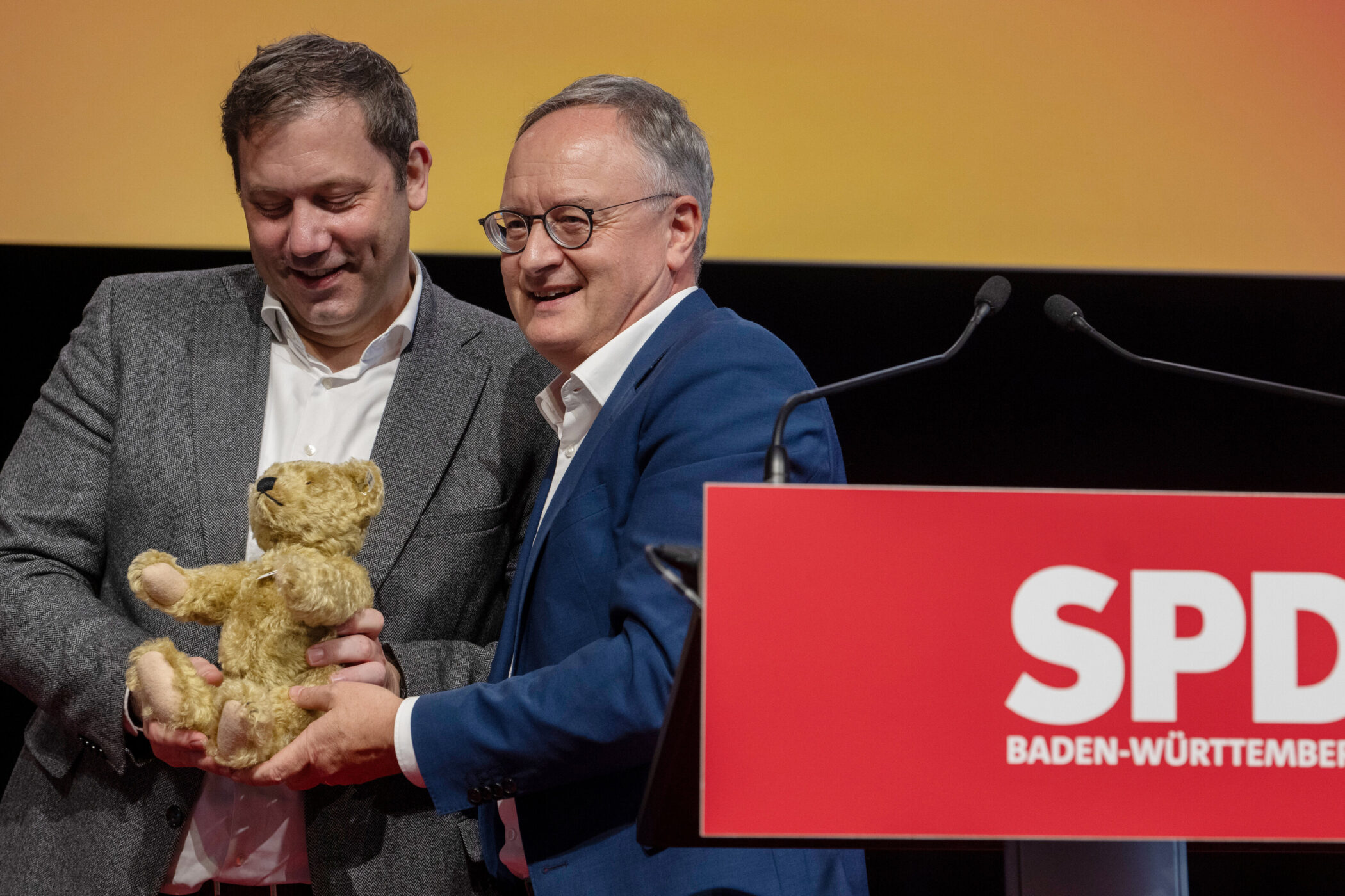 Beim Landesparteitag der SPD Baden-Württemberg erhält Lars Klingbeil (l), Bundesvorsitzender der SPD, von Andreas Stoch, Landesvorsitzender der SPD Baden-Württemberg, in der Donauhalle einen Teddybären.