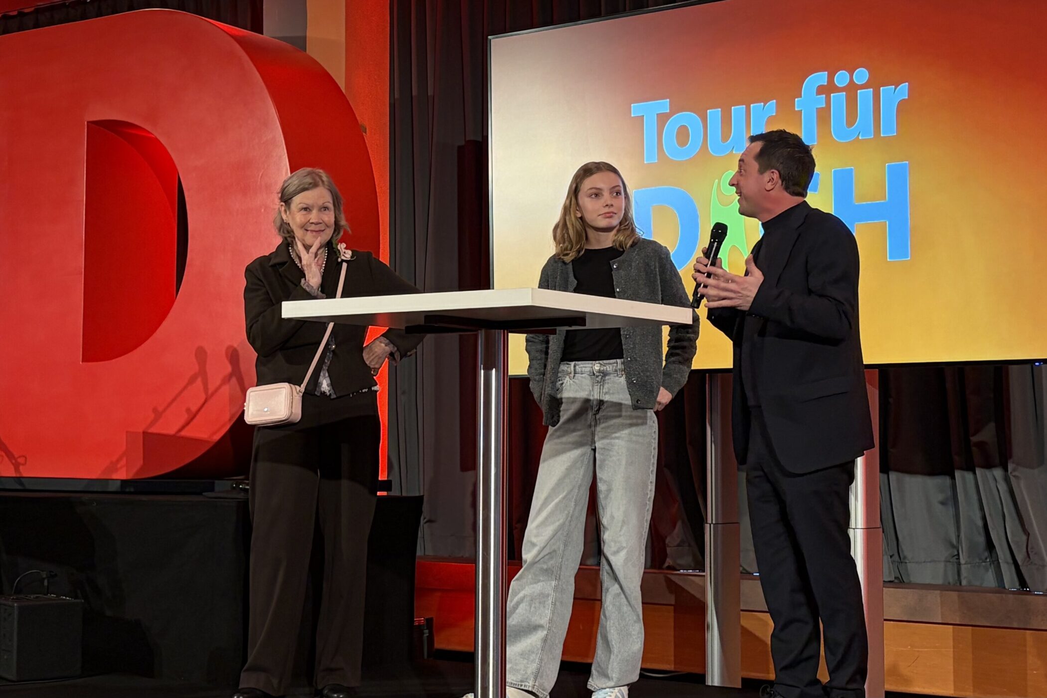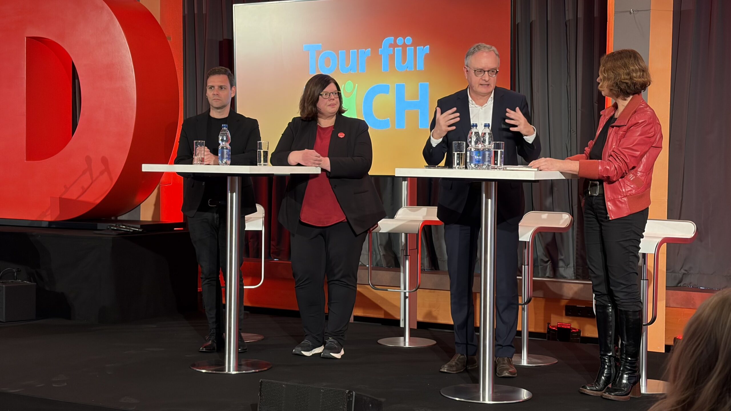 Im Gespräch mit Generalsekretär Sascha Binder (rechts): Rentnerin Rose und Schülerin Frida. Beide sind Gesichter der Wahlkampagne der SPD.