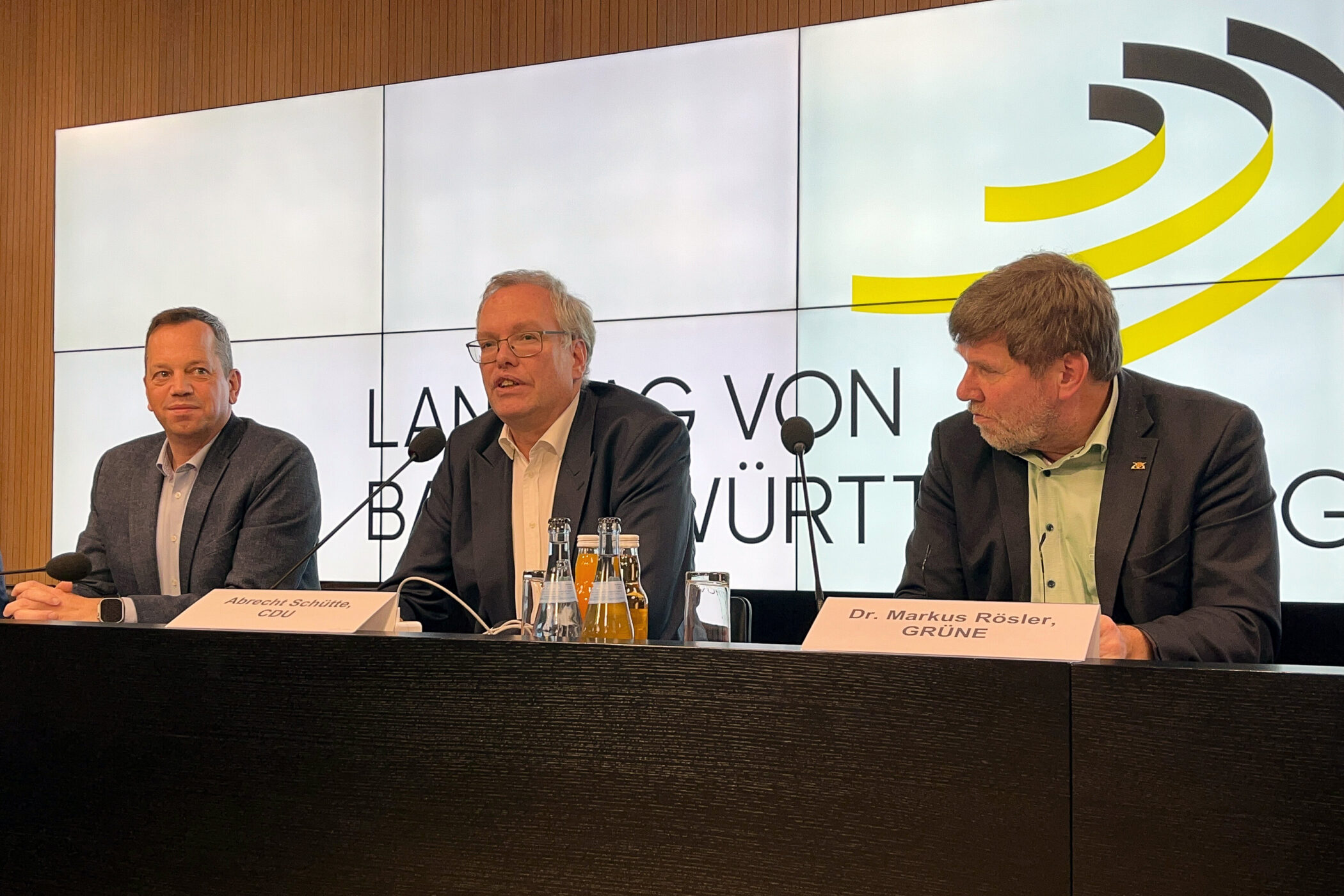 Die Landtagsabgeordneten Nicolas Fink (SPD, links), Albrecht Schütte (CDU) und Markus Rösler (Grüne, rechts) nehmen an einer Pressekonferenz zu den Haushaltsberatungen teil.