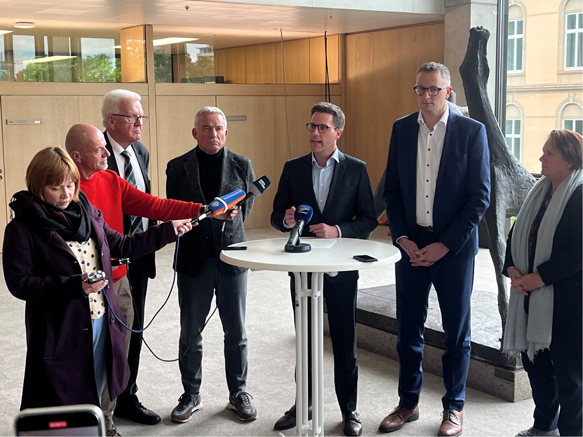Die Spitzen der grün-schwarzen Koalition präsentieren im Landtag die Einigung zum Sprachpaket und G9.