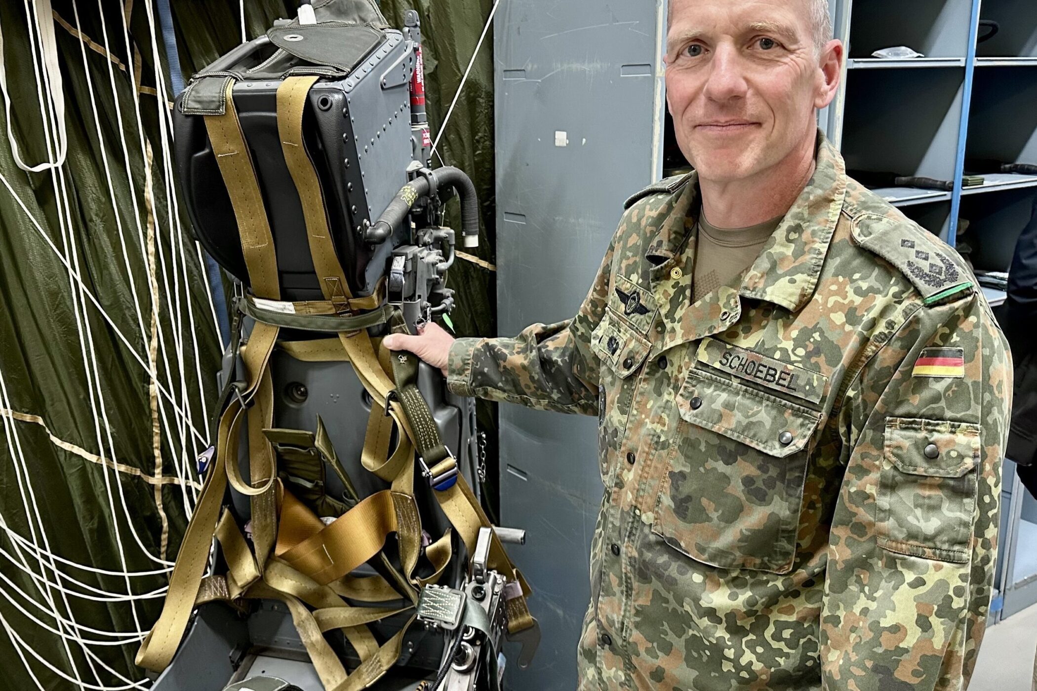 Dieser Notausstieg aus dem Jet komme allerdings sehr selten vor, erklärt der Kommandeur der Staufer-Kaserne. Christian Schoebel spricht von 13 bis 16 G, die dann auf einen Eurofighter- oder Tornado-Piloten einwirken können. Bei 14 G wirkt eine Kraft, die 14-mal so stark ist wie die Schwerkraft. Statt 70 Kilo wiegt der Körper in diesem Moment plötzlich 980 Kilo. „Beim Ausstieg wird die Wirbelsäule um etwa einen Zentimeter gestaucht. Wer mit dem Schleudersitz raus musste, darf danach in der Regel nicht mehr fliegen.“