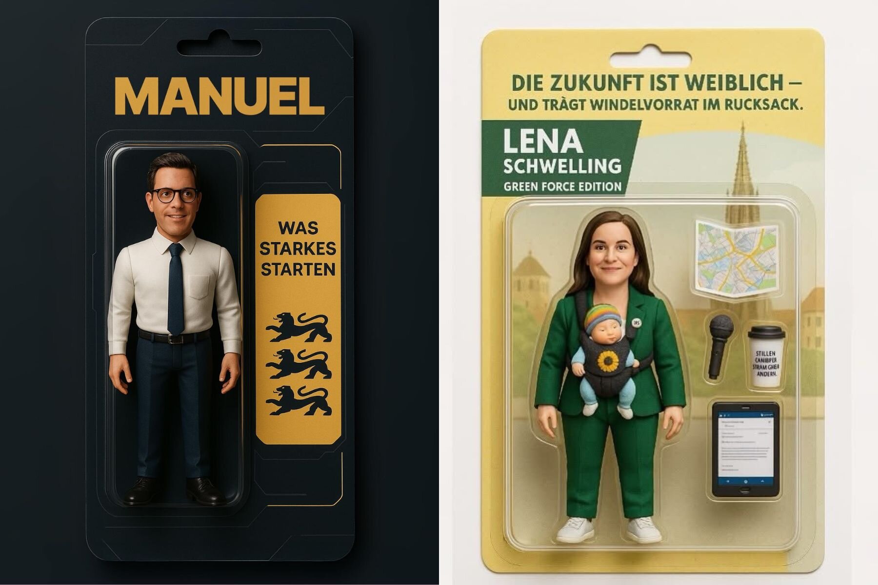 Eine Figur der besonderen Art hat sich die Landesvorsitzende der Grünen, Lena Schwelling, erstellt. In der „Green Force Edition“ gibt es von ihr eine „Die Zukunft ist weiblich – und trägt Windelvorrat im Rucksatz“ Figur mit Babytrage und Ulmer Stadtplan. Eine ihrer Spezialfunktionen, wie sie schreibt: „’Kompromiss-Kombo‘: Wenn du beide Arme bewegst, startet sie eine überzeugende Debatte und bringt zwei verfeindete Fraktionen an einen Tisch.“