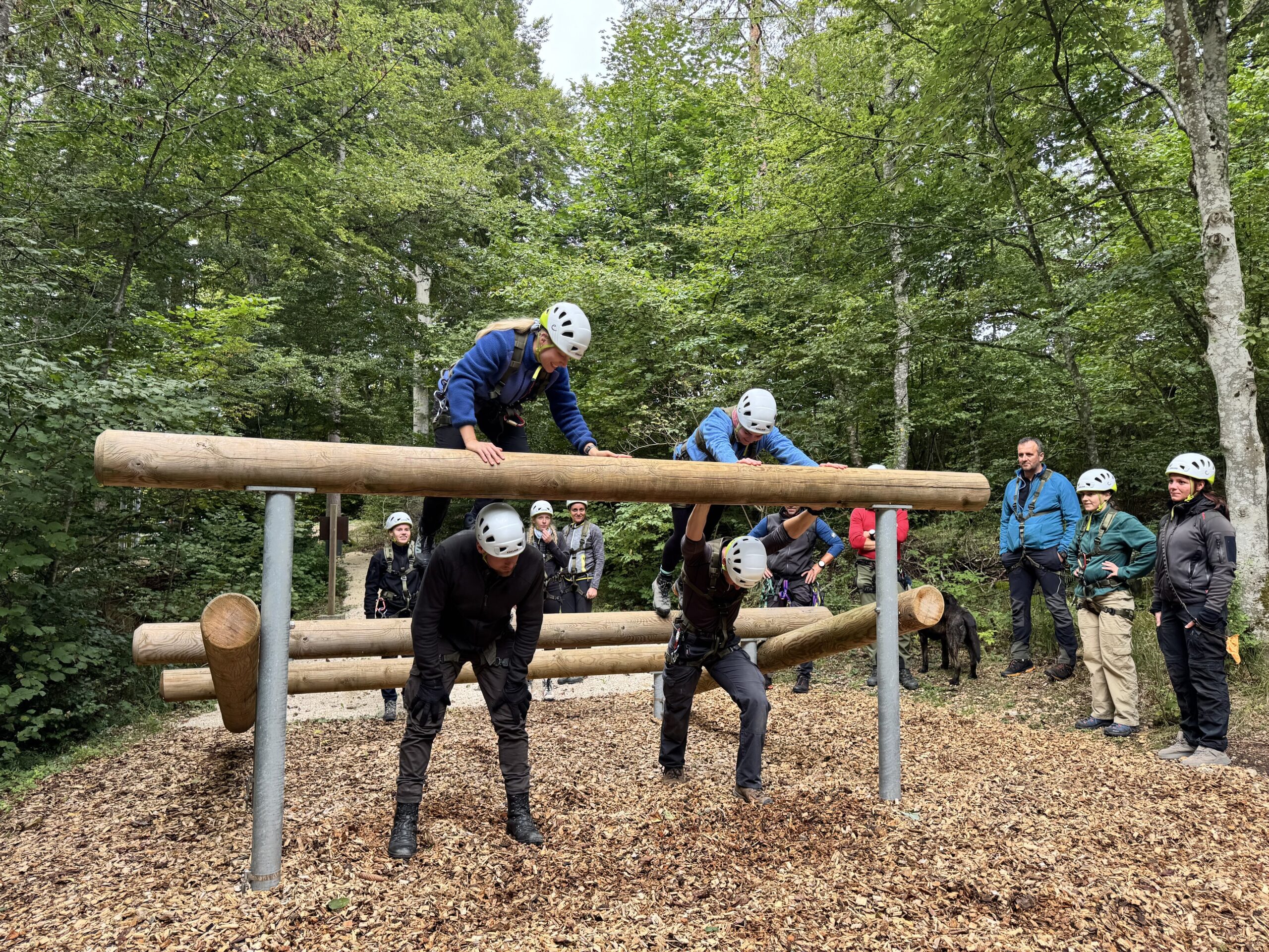 Ein weiteres erfordert Geschick beim Klettern. Hier lässt die Gruppe viel Zeit liegen. Ein Betonstein mit Absätzen und zwei Öffnungen, durch die man klettern muss, ohne den Boden zu berühren, stellt die Gruppe auch organisatorisch vor Herausforderungen. Die Übung wird mehrmals abgebrochen, weil jemand oder etwas den Boden berührt hat. Es geht alles ein wenig durcheinander, nicht alle sind immer voll bei der Sache.