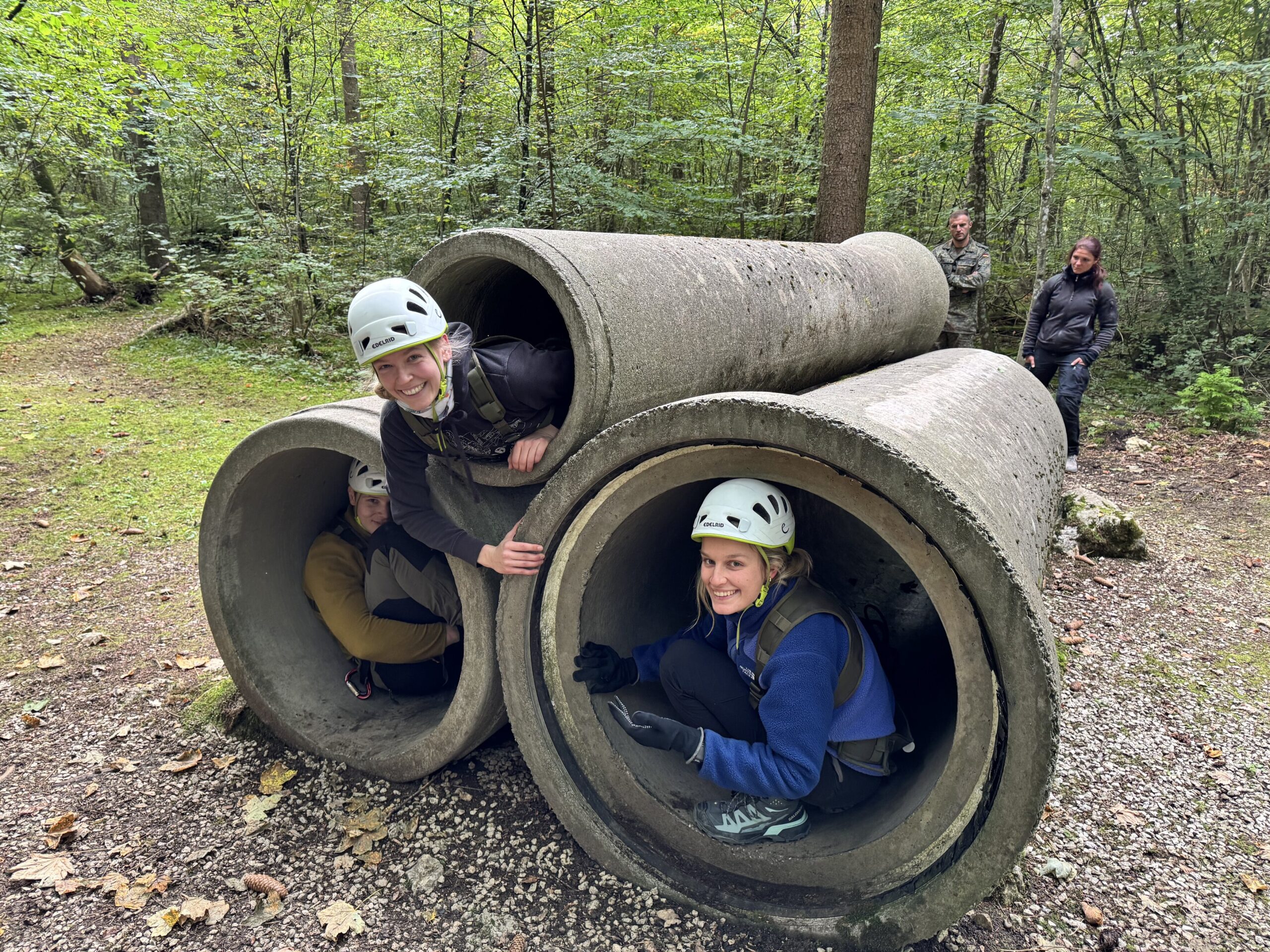 Zunächst geht es für die Studierenden durch eine von drei Betonröhren, die eine leichte Steigung haben. Wie man durchkommt, ist Grünbaum egal – ob kriechend, robbend, krabbelnd, jeder entwickelt seine eigene Technik, es muss auch nicht schön aussehen. Ziel ist, alle Hindernisse zu überwinden. Und zwar mit allen – und auch mit allem, was die Studierenden mit sich herumtragen. „Verteilt die Last, verteilt eure Kräfte, es kann nicht einer immer allen anderen helfen. Passt alle gegenseitig aufeinander auf, helft euch. Los geht’s“, sagt Greeni.
