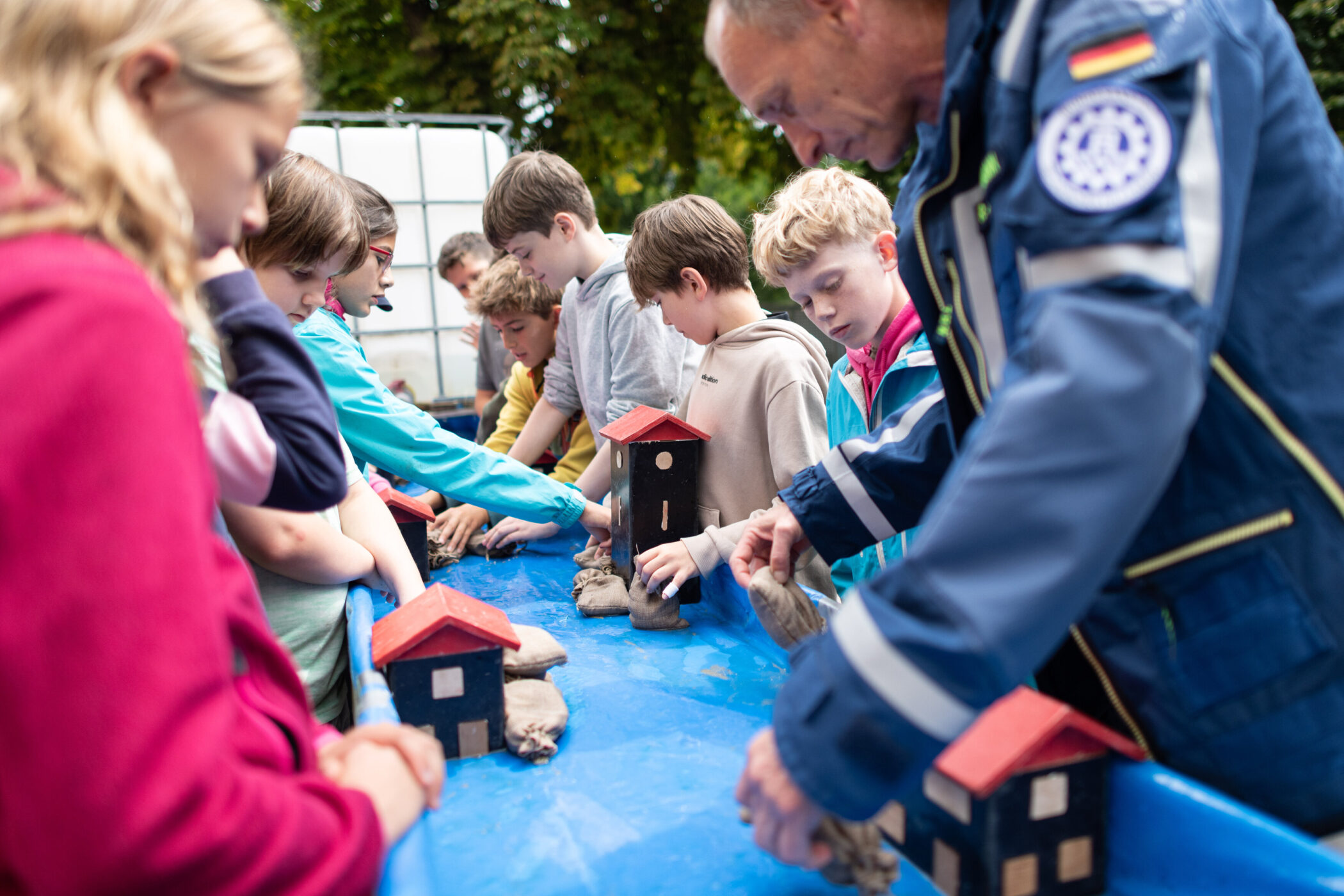 Gegenüber, ein Blickfang vor dem Schuleingang, steht ein Feuerwehrauto. Rechts daneben zum Schulhof hin füllen Jungen und Mädchen Säcke mit Sand und bilden anschließend eine Kette zu deren Transport. Welcher Abstand ist sinnvoll, damit die Säcke schnell und reibungslos weitergereicht werden können? Spielerisch lernen sie, was im Notfall funktioniert. Wenige Meter daneben simuliert ein Modell die Überschwemmung einer Ortschaft. Wo müssen die Säcke platziert werden, damit sie Häuser wirklich schützen?
