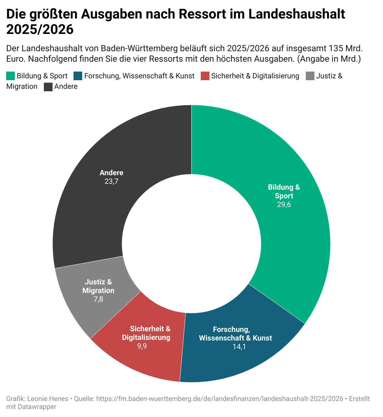 Das Ressort „Bildung und Sport“ erhält den größten Anteil am Haushalt. Das Kultusministerium bekommt rund 29,5 Milliarden Euro. Diese Mittel fließen unter anderem in die frühkindliche Sprachförderung und den Ausbau der Ganztagesbetreuung an Grundschulen.