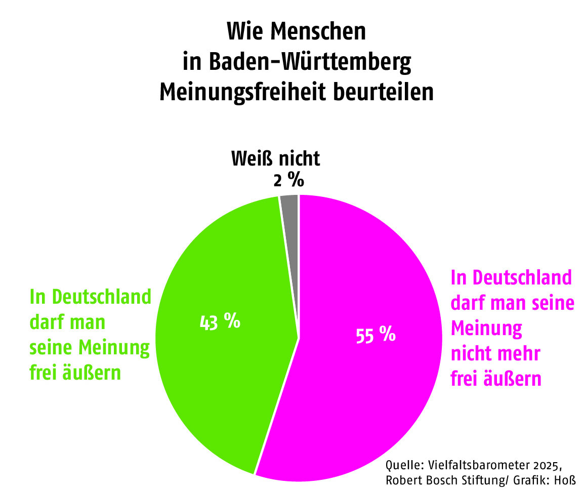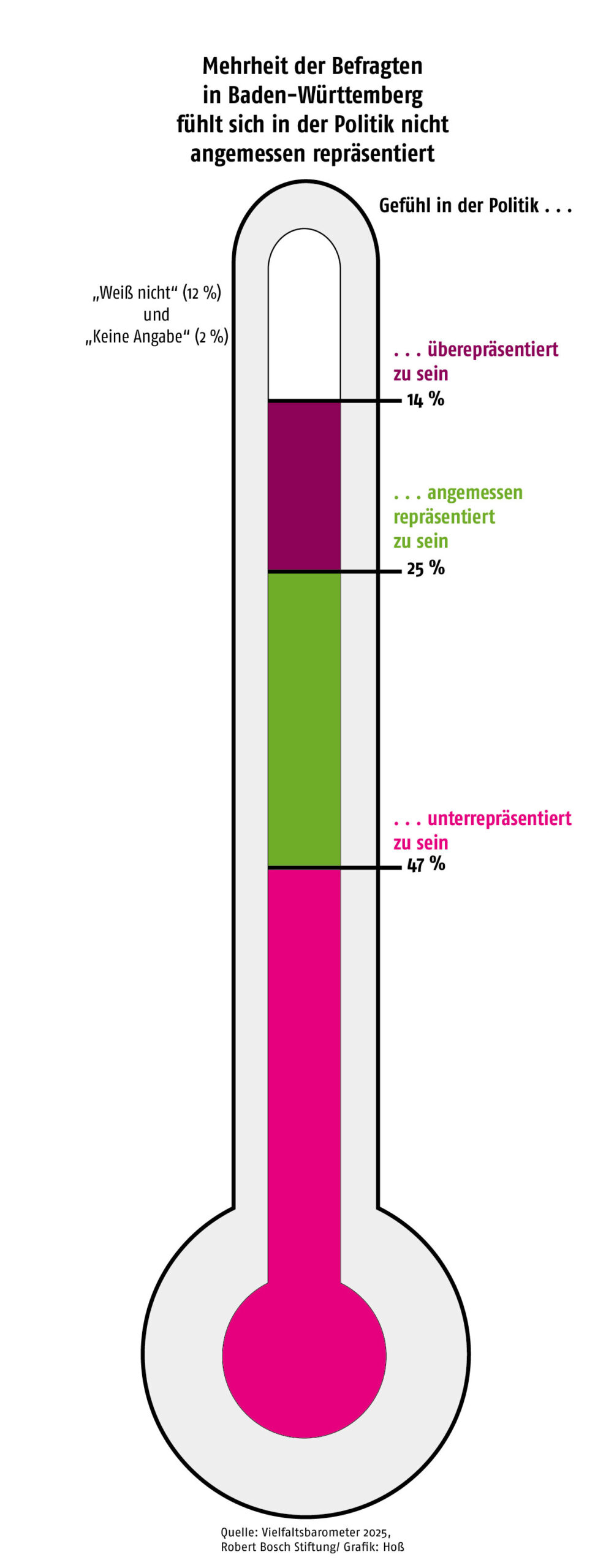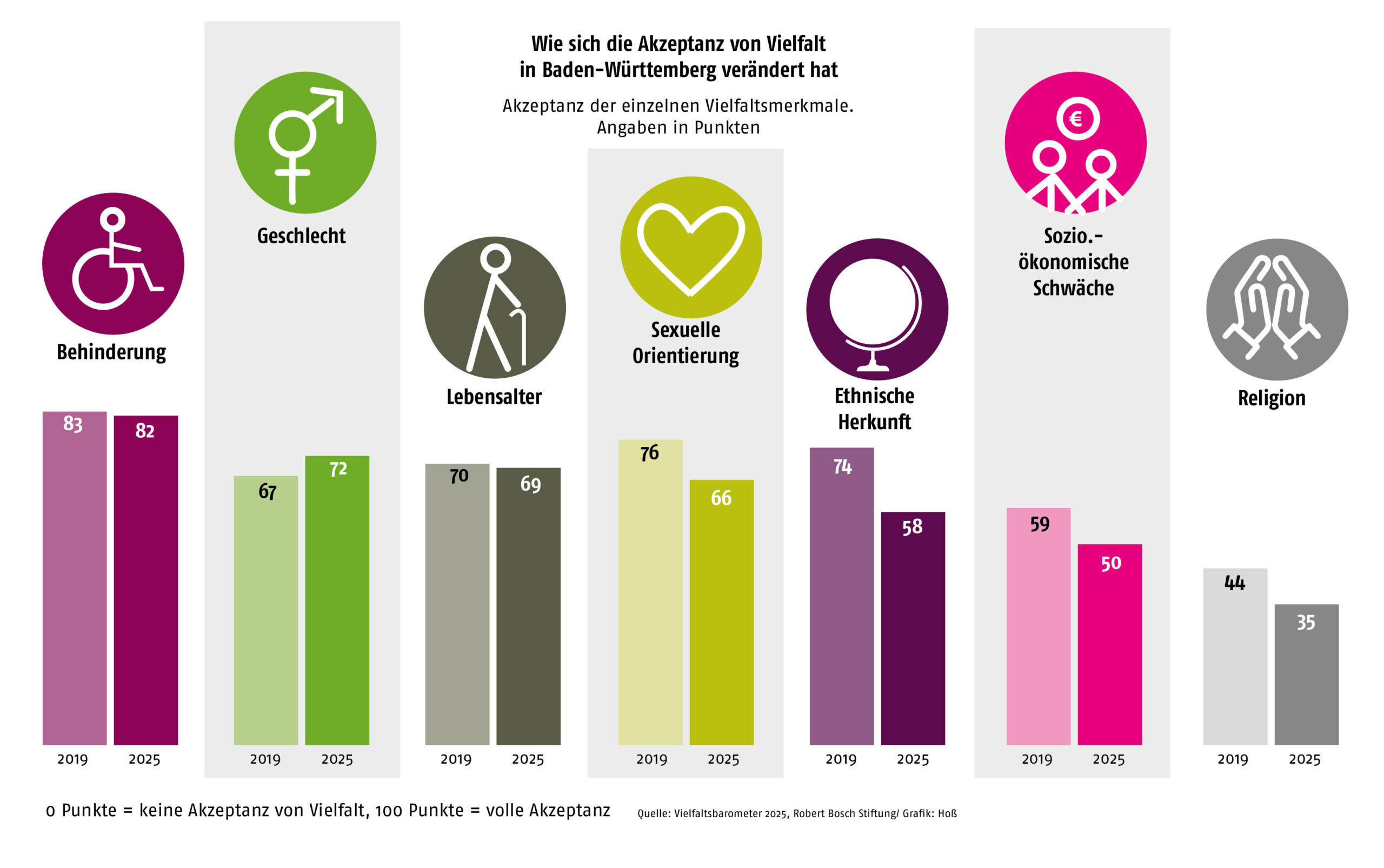Das Vielfaltsbarometer der Robert Bosch Stiftung ist eine repräsentative Befragung zum gesellschaftlichen Zusammenleben in Deutschland. Es misst Einstellungen zu sieben Dimensionen von Vielfalt: Lebensalter, Behinderung, Geschlecht, sexuelle Orientierung, sozioökonomische Schwäche, ethnische Herkunft und Religion. Für die Ausgabe von 2025 wurden vom 2. Mai bis zum 3. Juni dieses Jahres 4761 deutschsprachige Personen ab 16 Jahren online befragt, darunter 518 Personen in Baden-Württemberg. Die Studie wurde vom wissenschaftlichen Team der Constructor University Bremen im Auftrag der Robert Bosch Stiftung konzipiert und ausgewertet.