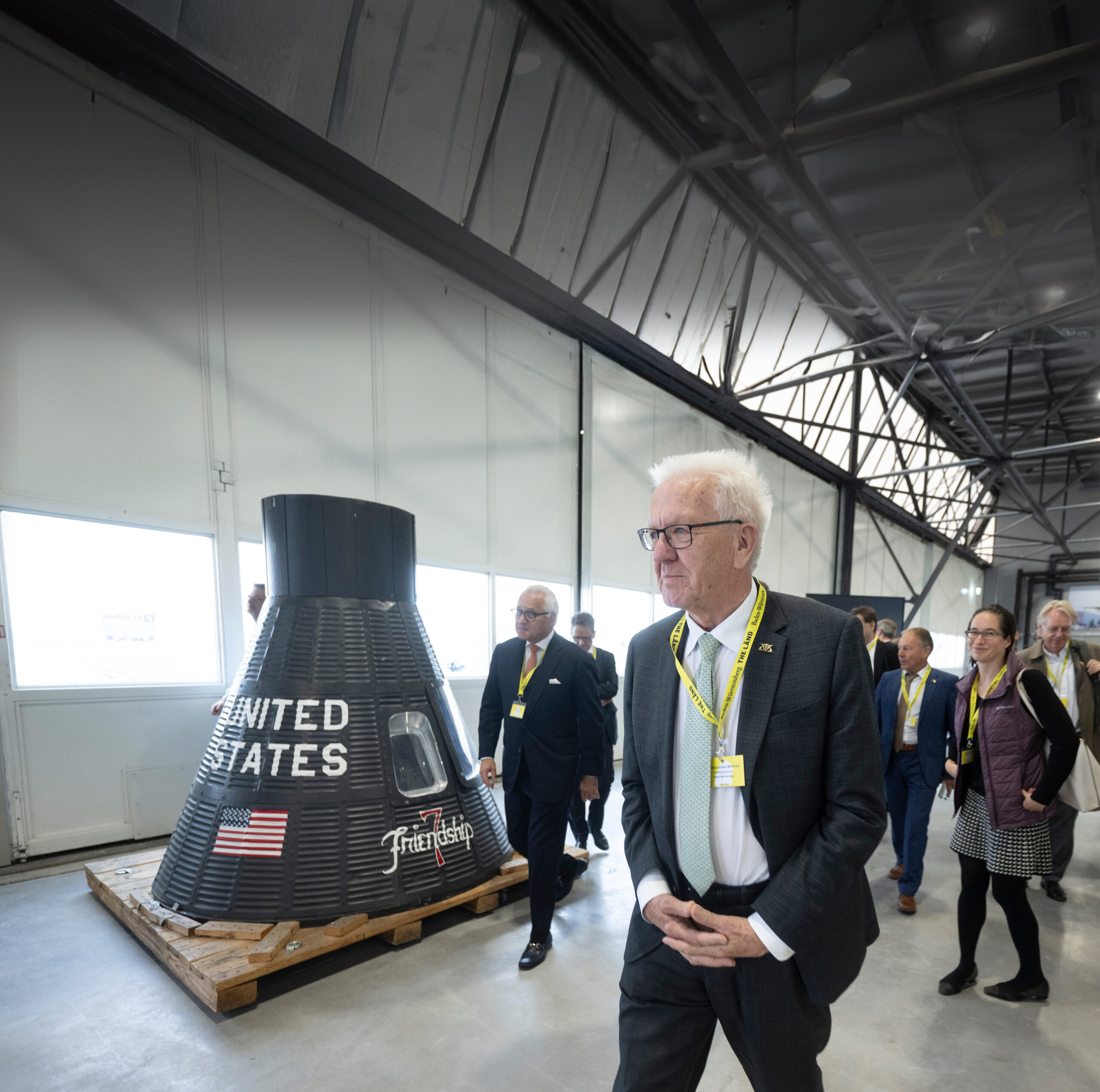Winfried Kretschmann (Bündnis 90/Die Grünen, m), Ministerpräsident von Baden-Württemberg, und Peter Bodmer (l), Präsident der Stiftung Innovationspark Zürich, gehen im Space Hub der Universität Zürich an einem Nachbau der Friendship 7 Raumkapsel vorbei. Am letzten Tag von Kretschmanns Reise stehen Unternehmensbesuche in der Raumfahrtbranche und politische Gespräche mit der Kantonsregierung Zürich auf dem Programm. Foto: Marijan Murat