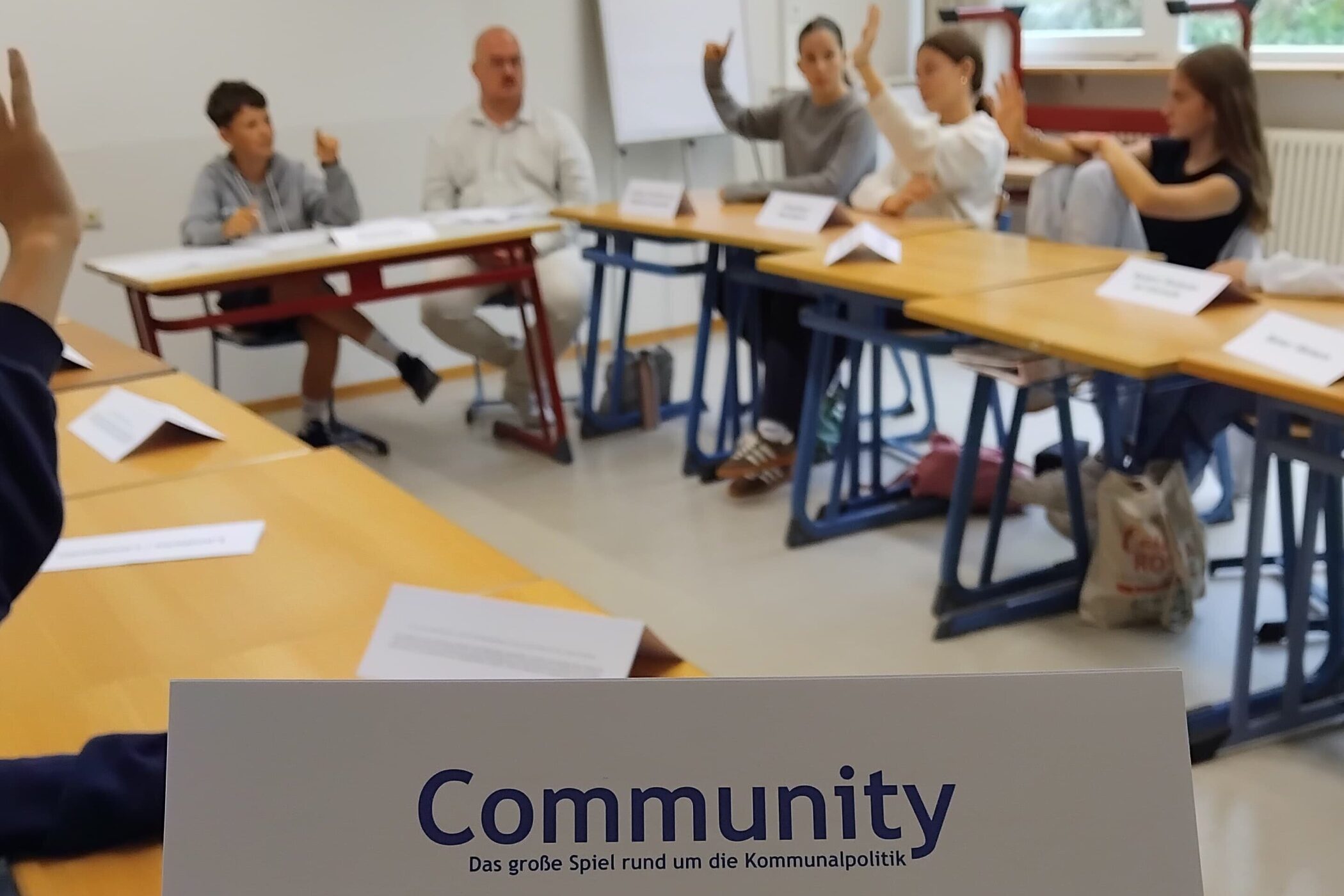 Der Unterricht, Pardon die Gemeinderatssitzung, beginnt – nicht nach der Gemeindeordnung, sondern gemäß den (Spiel-)Regeln von „ Community “. Ein Lehrer ist dabei, doch nur als Zuschauer. Studierende der Hochschule Kehl, wo das Spiel entwickelt wurde, moderieren die Gruppen. Eine davon ist Nina Herr.