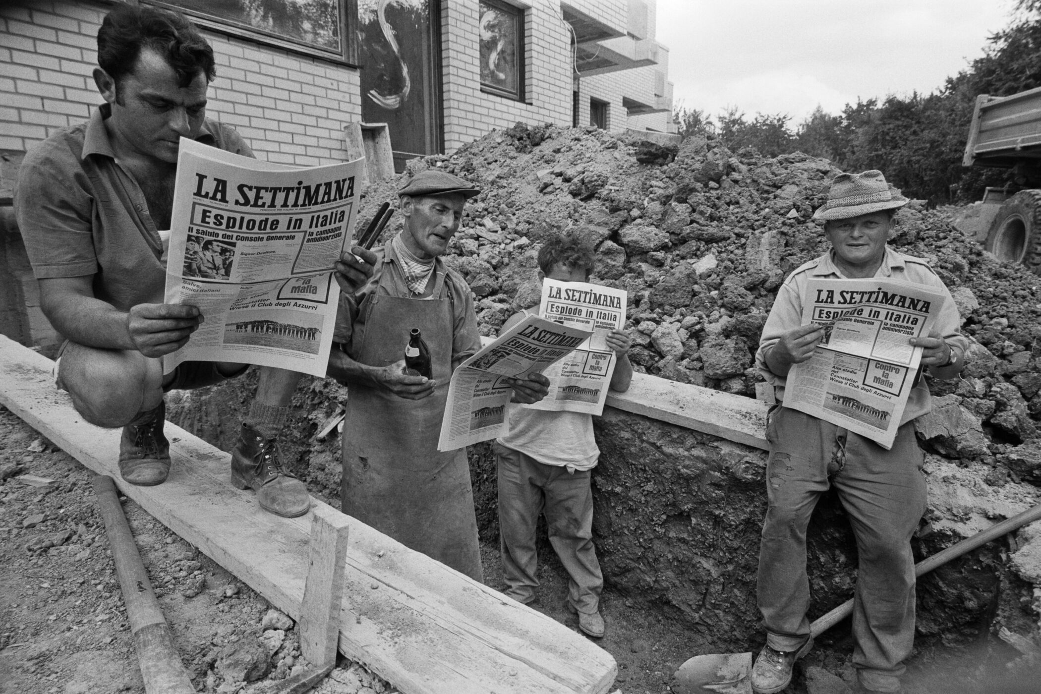 Italienische Arbeiter lesen auf einer Baustelle die 1971 in Stuttgart herausgegebene italienische Wochenzeitung „La Settimana“.