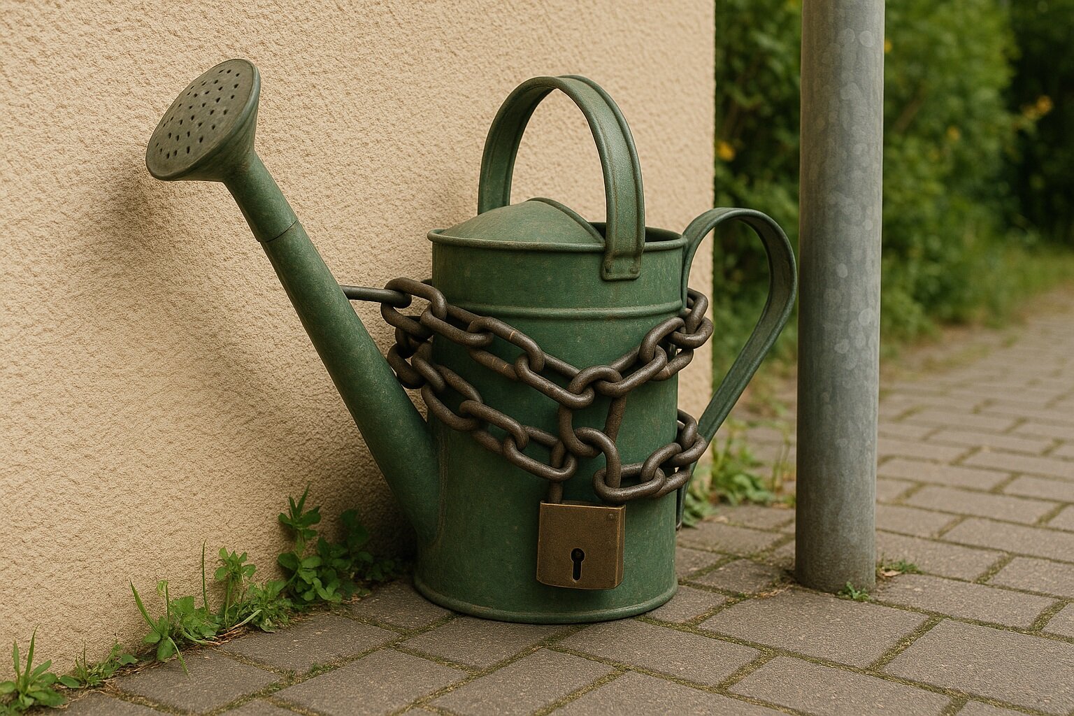 KI-generiert mit ChatGPT, Prompt: Andrea Trajanoska)Gott sieht alles, heißt es. Aber zumindest die Friedhofsverwaltung hat sich mittlerweile vielerorts dazu durchgerungen, lieber auf das Prinzip „Vertrauen ist gut, Kontrolle ist besser“ zu setzen. Denn, so die Meldung zum 4. Juli, dem Tag, an dem Amerika seine Unabhängigkeit und die übrige Welt den Tag der Gießkanne begeht: Einige Kommunen nutzen auf ihren Friedhöfen daher Pfandsysteme für ihre Leih-Gießkannen.