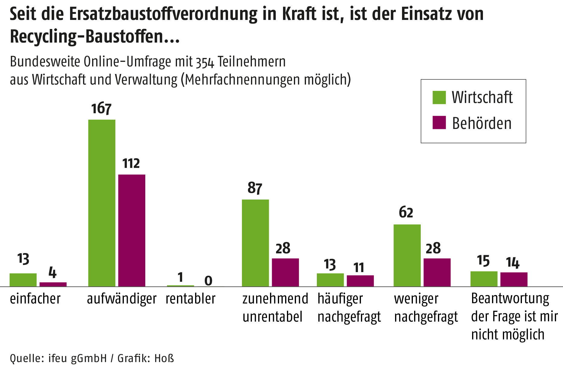 Die Akzeptanz für Ersatzbaustoffe sei in den vergangenen zwei Jahren „tendenziell gesunken“, erklärte Nadine Muchow vom Heidelberger Institut für Umwelt- und Energieforschung (Ifeu), das zusammen mit anderen Partnern die Evaluierung für das Umweltministerium in Form eines Planspiels mit Vertretern der Rohstoff- und der Bauwirtschaft sowie aus Behörden durchgeführt hat. Zusätzlich gab es eine Onlinebefragung mit mehr als 350 Teilnehmern.