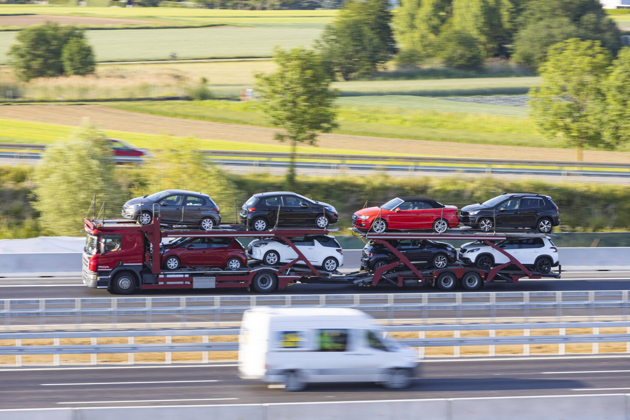 Ein Autotransport auf der Autobahn A8 bei Stuttgart.
