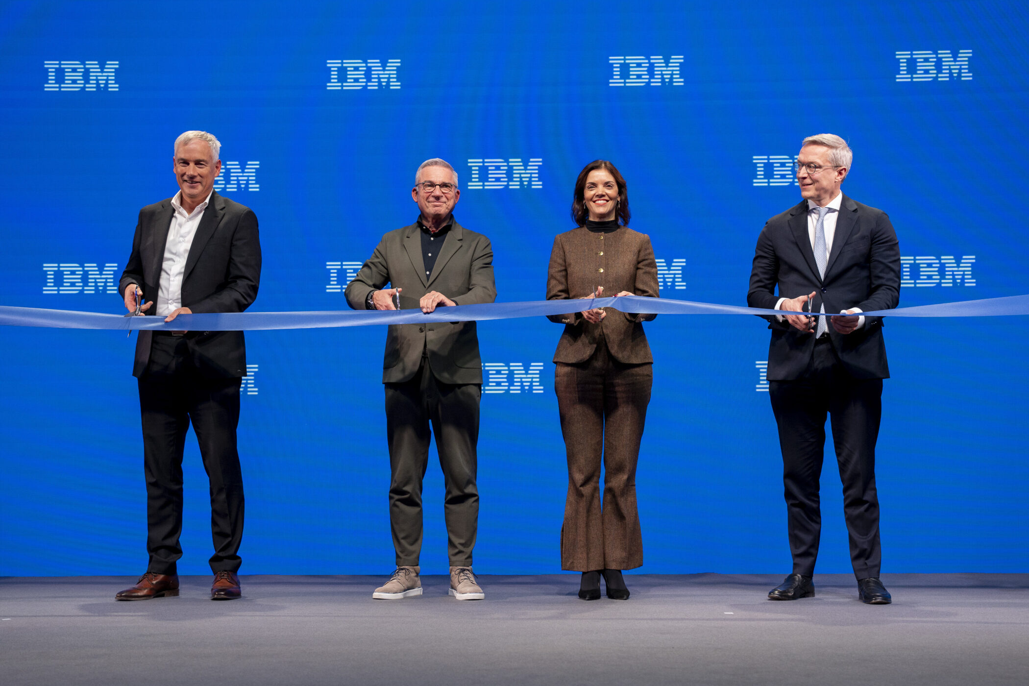 IBM-Deutschland-Chef Wolfgang Wendt, Innenminister Thomas Strobl, IBM-Europa-Chefin Ana Paula Assis und Bundesdigitalminister Karsten Wildberger (von links) eröffnen die neue Deutschland-Zentrale von IBM.
